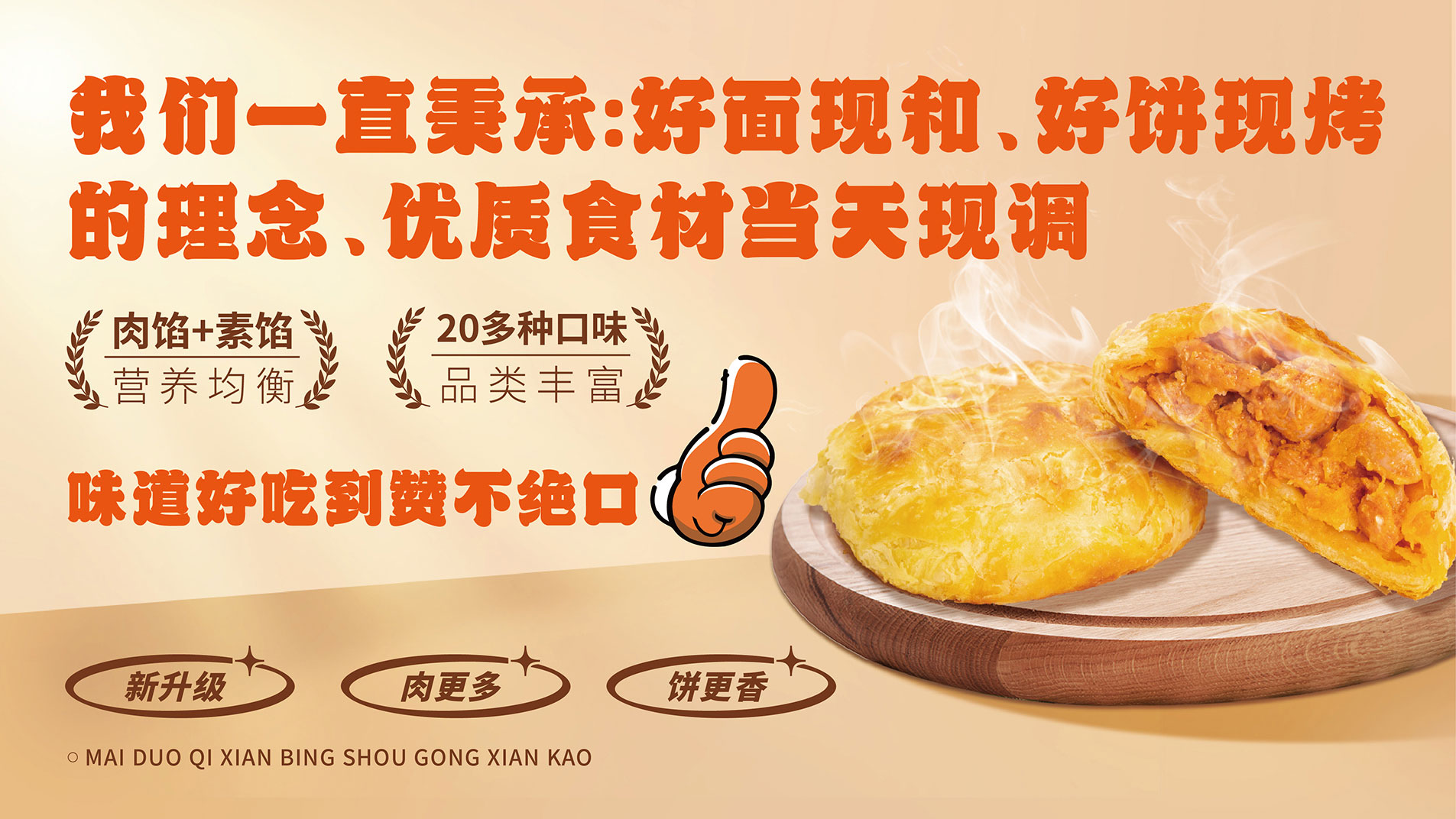 今年我們河南麥多餡餅食品有限公司推出了新產(chǎn)品:“麥多奇鮮肉餅”。我們新出的麥多奇鮮肉餅采用整店明廚亮灶、一條條前腿肉掛在窗口處,一袋袋高筋面粉擺在案板上,店內(nèi)工作人員現(xiàn)場制作,純手工和面、調(diào)餡,一個(gè)餅使用一兩肉……